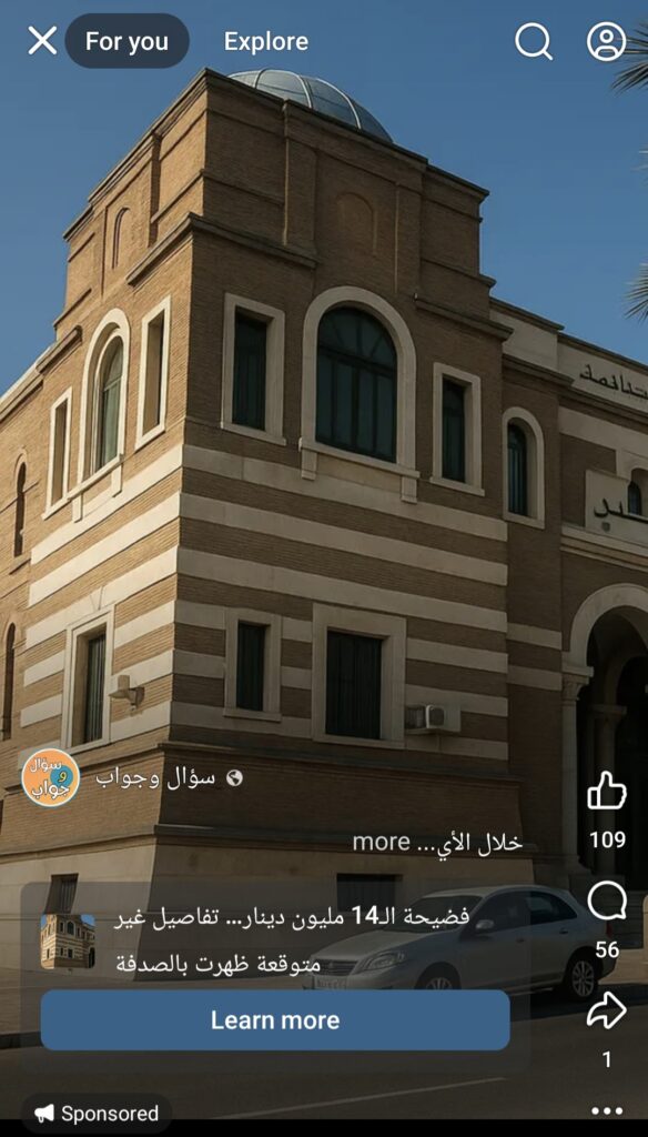 ⚠️ صفحات “سؤال وجواب” الوهمية… أسلوب جديد للنصب الإلكترونيخلال الفترة الأخيرة، ظهرت صفحة على فيسبوك تستخدم عنوان “سؤال وجواب”، لكنها تعتمد أسلوب تضليلي بإطلاق عناوين مثيرة مثل “فضيحة 14 مليون اختفت من حسابات الدولة” أو “تحويل بنكي مشبوه… استثمر بـ3000 دينار ليبي”، بهدف جذب الضحايا.الصفحة تروّج لفيديوهات لمشاهير يتحدثون عن الاستثمار بشكل مُفبرك، وتستخدم صورًا رسمية مثل مبنى مصرف ليبيا المركزي لتعطي نفسها مصداقية وهمية.ورغم ادعائها أنها مقرّها “السعودية”، إلا أن الأدمن ليس ليبي ولا حتى من دولة عربية—كما يظهر من لغة الردود وطريقة إدارة الصفحة—ما يؤكد أنها شبكة خارجية تستهدف الليبيين تحديدًا.هذه الصفحات لا تقدّم استثمارًا… بل تصطاد في المياه العكرة وتستغل الوضع الاقتصادي لجذب الناس نحو روابط مشبوهة.🛑 احذر:أي صفحة تستعمل:عناوين مثيرة ومضللةصور مصرف ليبيا المركزي أو مؤسسات الدولةفيديوهات مشاهير مُقتطعة أو مُفبركةوعود ربح سريعفهي بنسبة كبيرة صفحة احتيال إلكتروني تهدف لسرقة بياناتك أو أموالك.