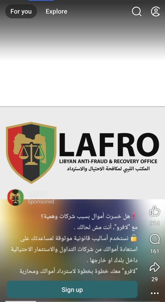 اللافت إنهم يستخدموا إعلانات ممولة موجّهة لليبيين، ويستعملوا فيها صور معالم ليبية لإيهام الناس بأنها جهات محلية، مثل: